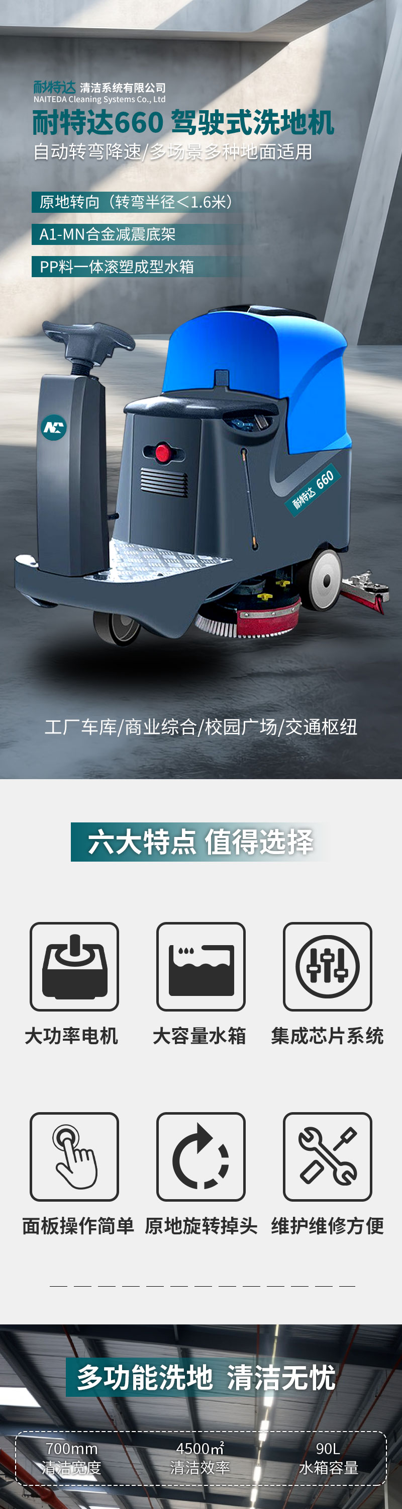 适用于工厂车库、综合商超、校园广场、交通枢纽等公共场所。转弯半径小于1.6米,采用合金减震底架,水箱一体滚塑成型工艺。700mm清洁宽度,清洁效率每小时可达到4500㎡。LED代码屏显,可根据故障代码自行排出设备故障。